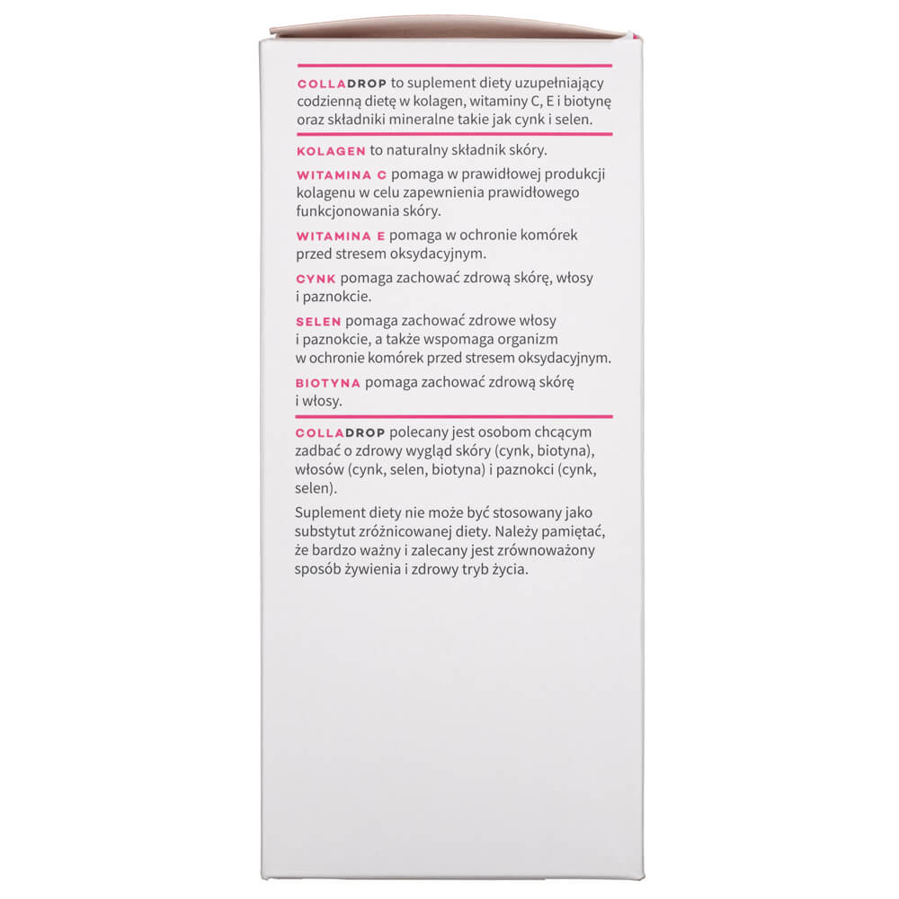 Ūdens, NatiCol ® kolagēns no jūras zivju ādas, saldinātājs: invertcukurs, L-askorbīnskābe (C vitamīns), cinka glikonāts, konservants: kālija sorbāts, D-alfa-tokoferols (E vitamīns), nātrija selenīts, D-biotīns.