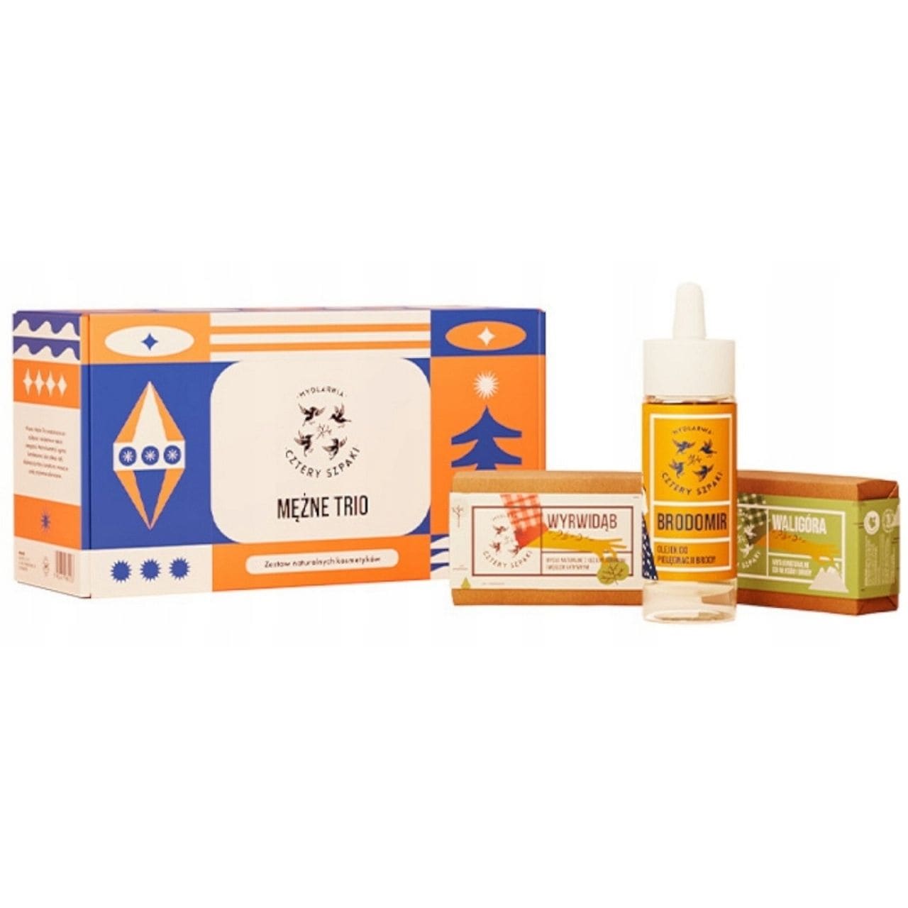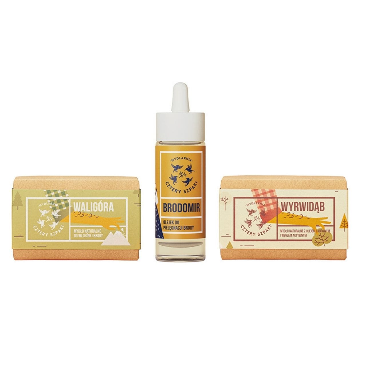 Elegantiškas natūralios kosmetikos rinkinys vyrams iš Lenkijos prekės ženklo Cztery Szpaki. Dėžutėje yra Brodomir barzdos aliejus, Waligóra barzdos muilas ir Wyrwidąb kūno muilas