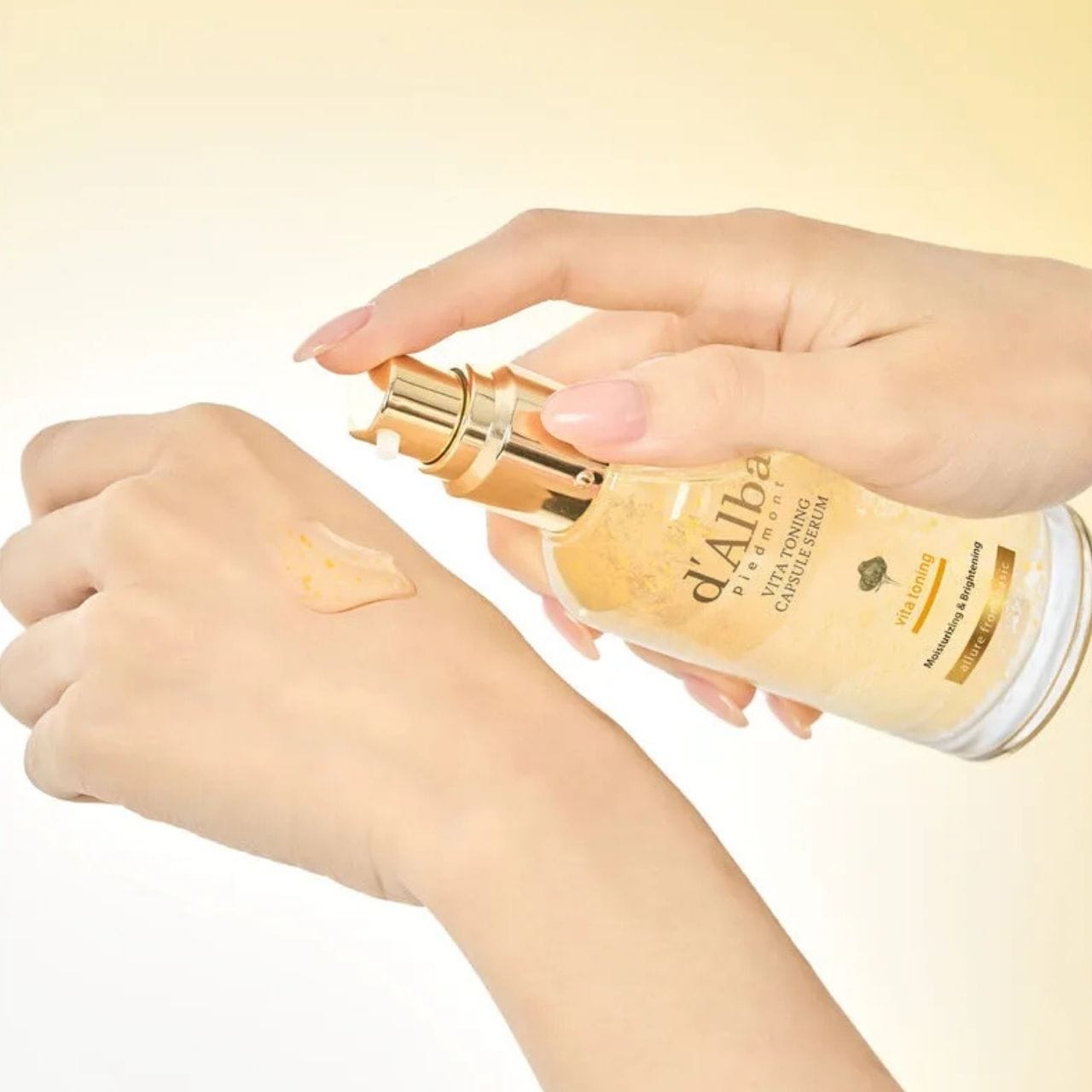 Serum D'Alba Vita Toning ar revolucionāru formulu, kuras pamatā ir tīrs smiltsērkšķu ūdens , kas nodrošina ādu ar dabīgu vitamīnu enerģiju. Unikālās 40,000 vitamīnu kapsulas, kas atbrīvojas lietošanas laikā, nodrošina intensīvu barošanu un tūlītēju izgaismojošu efektu. Uzlabotais Vitality Complex apvieno mitrinošas, reģenerējošas un pretnovecošanās aktīvās sastāvdaļas, kas sinerģiski darbojas no iekšpuses uz āru.