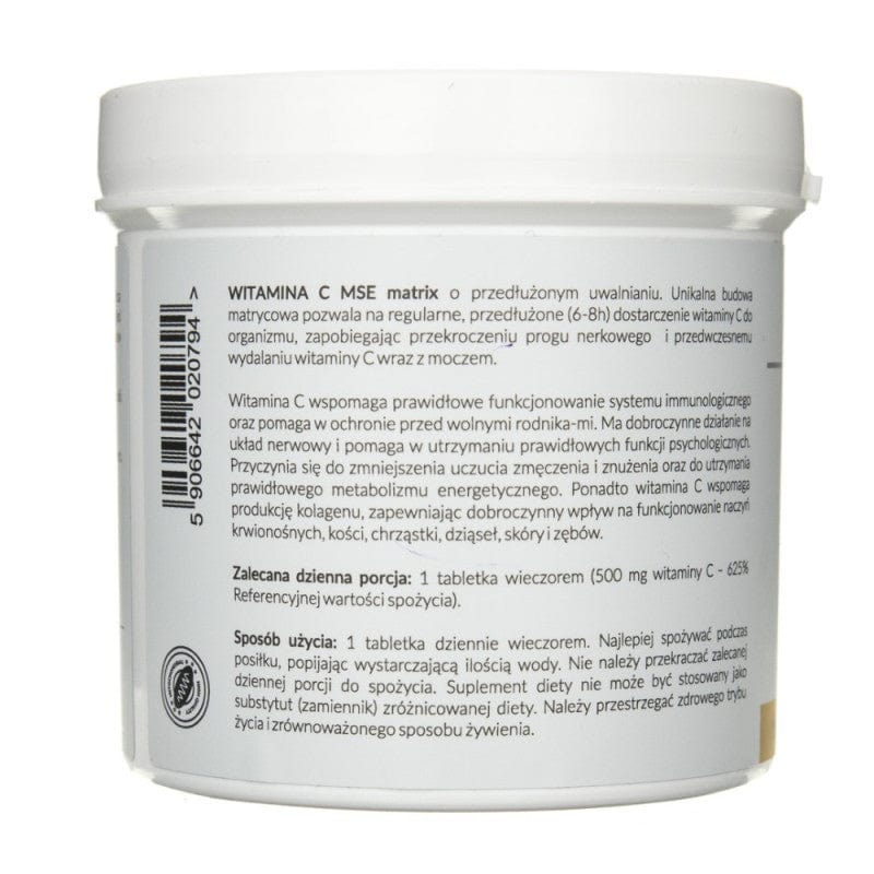 C vitamīna MSE matrica ir unikāls pagarinātas darbības preparāts. Pateicoties inovatīvas celulozes matricas, izmantošanai, tas nodrošina C vitamīna, ilgstošu piegādi organismā, kas darbojas līdz pat 8 stundām. Pakāpeniskā atbrīvošanās novērš nieru sliekšņa pārsniegšanu un priekšlaicīgu C vitamīna izdalīšanos ar urīnu. C vitamīna MSE matrica ir inovatīvs preparāts ar pakāpenisku noteiktas aktīvās vielas - L-askorbīnskābes - daļas izdalīšanos. Tabletes matricas struktūra - matrica - ļauj nodrošināt organismu ar ievērojamu C vitamīna daudzumu vienādos laika intervālos. Viela izdalās lēni un pakāpeniski, līdz pat 8 stundām pēc tabletes ieņemšanas.