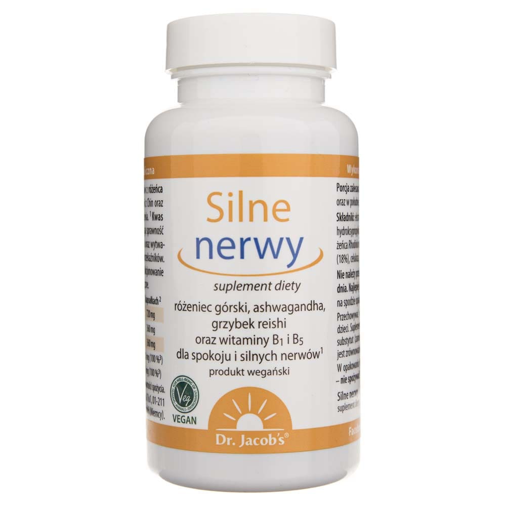 Strong Nerves no Dr. Jacob's ir uztura bagātinātājs celulozes kapsulu veidā, kas satur: rhodiola rosea , ashwagandha , reishi sēni un B1 un B5 vitamīnus mierīgiem un stipriem nerviem.