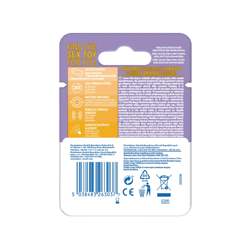 Vibrējošais gredzens Durex ir vibrējošs spilventiņš, kas paredzēts, lai sniegtu papildu baudu abiem partneriem. To ir viegli lietot, viegli ieslēgt un izslēgt, un tas ir ideāli piemērots eksperimentiem. Maksimālai vibrācijas baudai.
