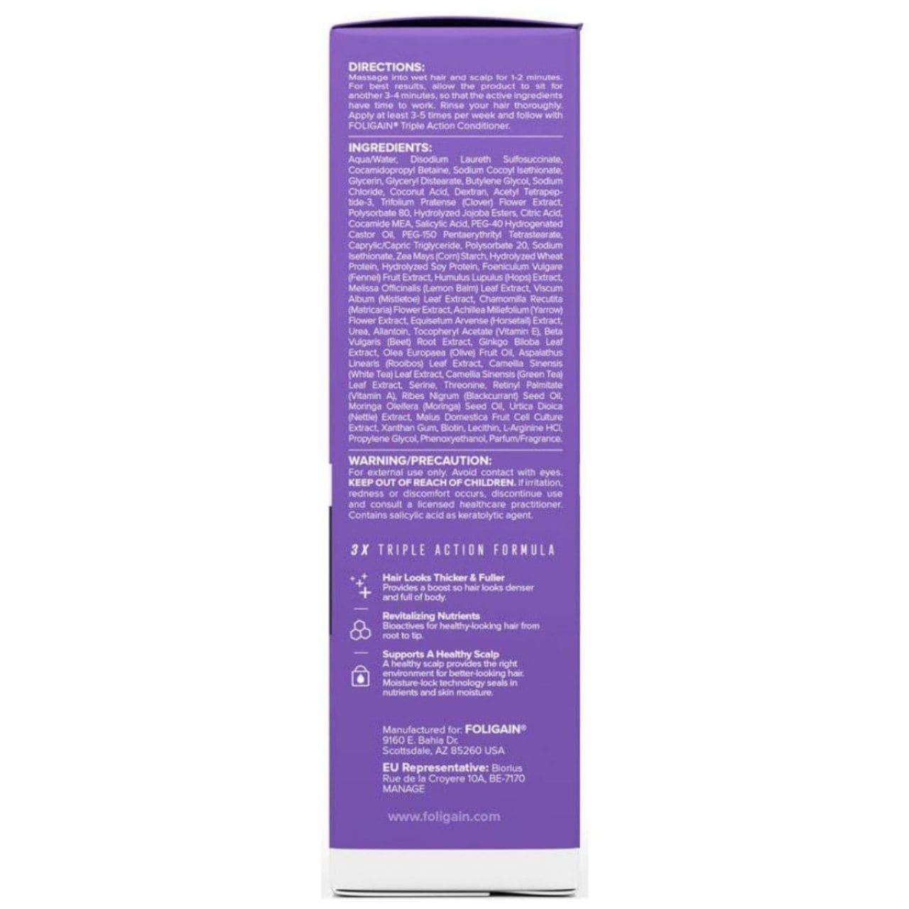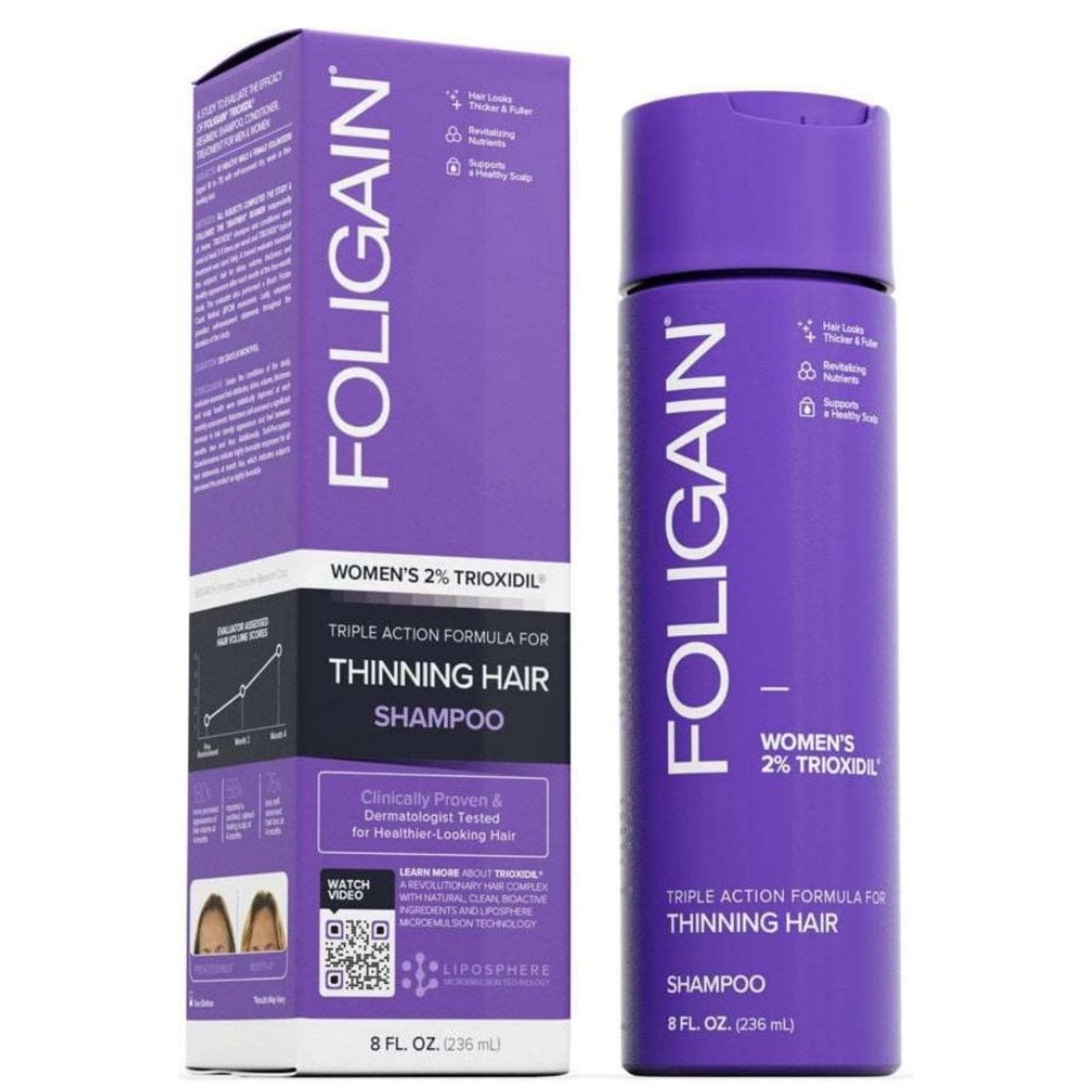FOLIGAIN trīskāršas iedarbības šampūns sievietēm ar retākiem matiem, kas satur 2% trioksidilu , ir atjaunojošs šampūns, kas efektīvi veicina matu blīvumu un samazina matu izkrišanu. Klīniski pārbaudītā formula palielina matu apjomu līdz pat 180% 4 mēnešu laikā, vienlaikus barojot galvas ādu un stiprinot matu folikulus.