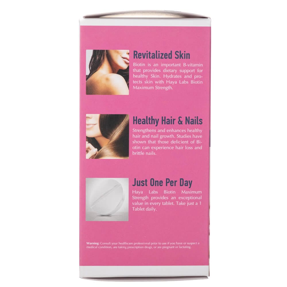 Haya Labs Biotin Maximum Strength ir uztura bagātinātājs tabletēs, kas satur lielu biotīna devu.