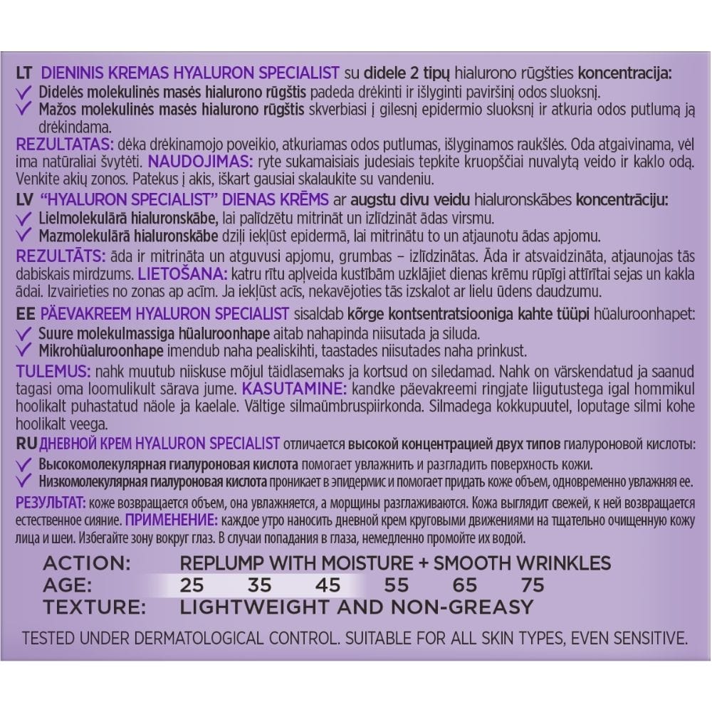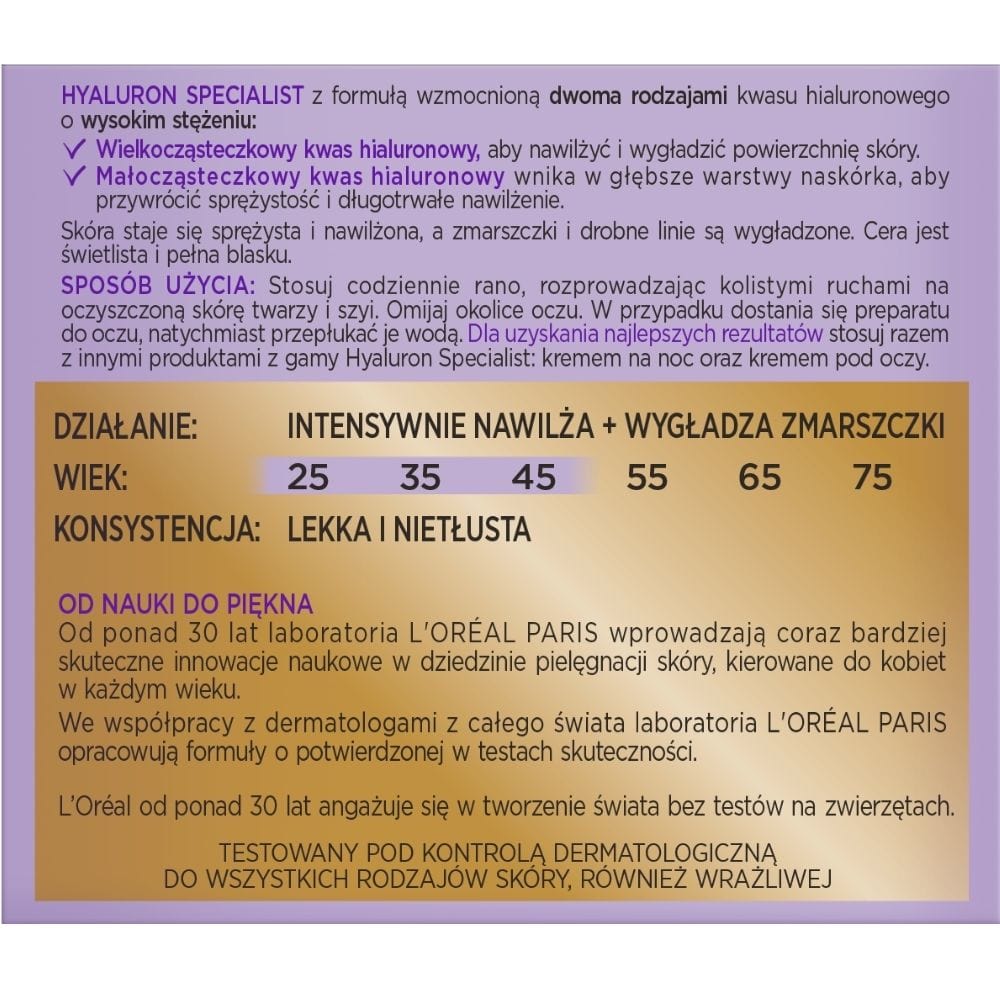 Hyaluron Specialist mitrinošais dienas krēms ir inovatīvs L'Oréal Paris Laboratories izstrādāts produkts, kas ir daļa no atjaunojošās mitrinošās aprūpes. Tas atbilst to sieviešu vajadzībām, kuras vēlas saglabāt ādas jaunību un svaigumu, efektīvi cīnās pret pirmajām novecošanās pazīmēm un nodrošina aizsardzību pret kaitīgajiem saules stariem.