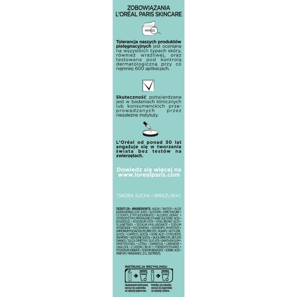 Aqua / Water, Aloe Barbadensis Leaf Juice (sok ze świeżych liści aloesu), Glycerin (gliceryna), Dimetikonas, Cetearilo etilheksanoatas, Denat alkoholis, Hidroksietilpiperazino etano sulfoninė rūgštis, Bisabololis (bisabolol), dinatrio edta, hialurono rūgštis (kwas hialuronowy), silanetriolis, Natrio hialuronatas (sól sodowa kwasu hialuronowego), Natrio hidroksidas, Tokoferolis (witamina E), Izopropilo miristatas, Amonio poliakriloildimetiltauratas, Butileno glikolis, Kaprilo glikolis (glikol kaprylowy), Citrinų rūgštis (kwas cytrynowy), Etilheksilo palmitatas, Heksileno glikolis, Silicio dimetilsililatas [Nano] / Silica Dimethyl Silylate, Xanthan Gum, Dimethiconol, Citral, Farnesol, Limonene, Linalool, CI 42090 / Blue 1, Fenoksietanolis, Kalio sorbatas, Natrio benzoatas, Sorbo rūgštis, Parfum / Fragrance (F.I.L B227883/1).