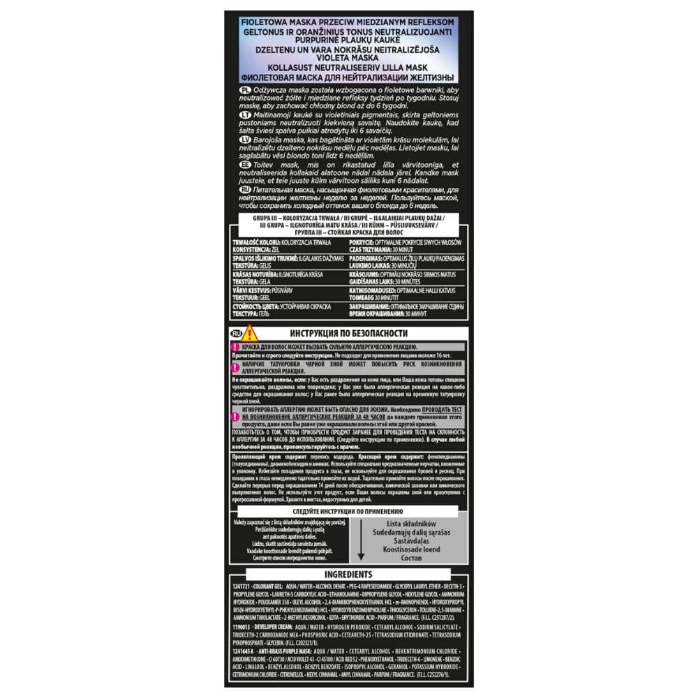Spalvotasis gelis: Trideceth-2 Carboxamide Mea, Propileno glikolis, Heksileno glikolis, PEG-2 oleaminas, Poligliceril-4 oleilo eteris, Oleilo alkoholis, Alkohol Denat., Amonio hidroksidas, Poligliceril-2 oleilo eteris, Oleino rūgštis, Natrio dietilaminopropilkokokaaspartamidas,2,4-diaminofenoksietanolis HCl, m-aminofenolis,2-amino-3-hidroksipiridinas, natrio metabisulfitas, hidroksipropil Bis (N-Hydroxyethyl-Phenylenediamine) HCl, Eugenol, Amonio acetatas, Linalool, p-Phenylenediamine, Alpha-Isomethyl Ionone, Resorcinol, EDTA, Citronellol, Eritorbo rūgštis, Parfum/Fragrance. (FIL C201769/1).
