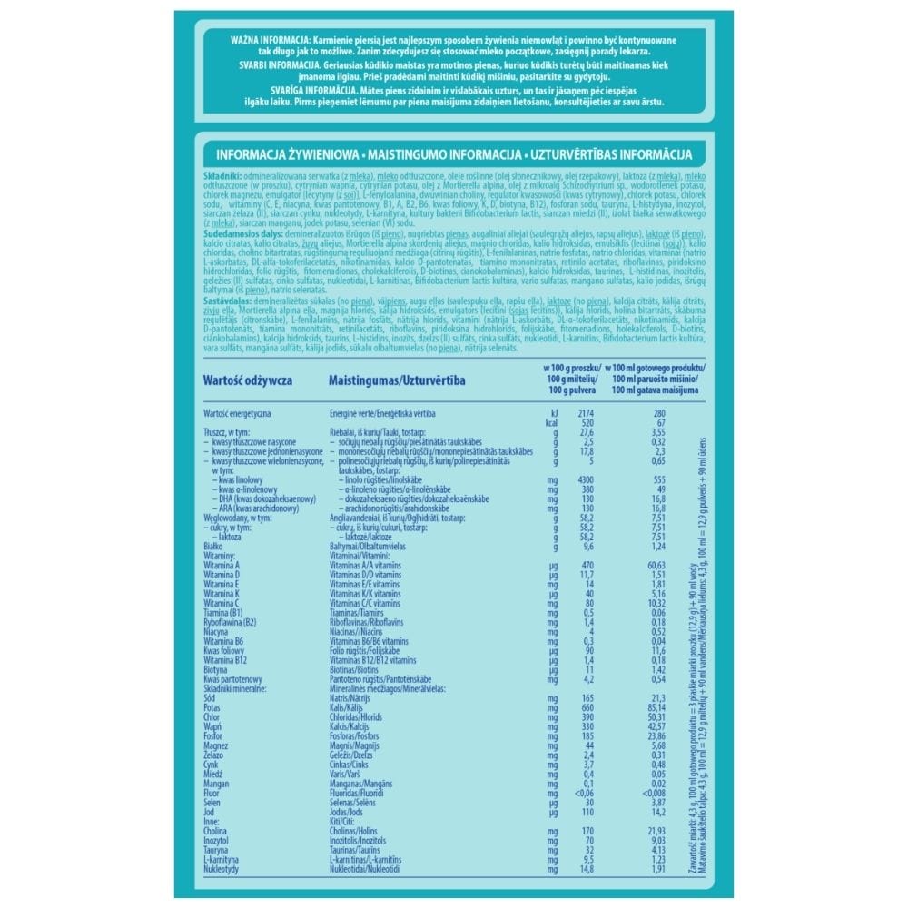 Demineralised whey (from milk), skimmed milk, vegetable oils (sunflower oil, rapeseed oil), lactose (from milk), calcium citrate, potassium citrate, fish oil, Mortierella alpina oil, magnesium chloride, potassium hydroxide, emulsifier (lecithins (from soya)), potassium chloride, choline bitartrate, acidity regulator (citric acid), L-phenylalanine, sodium phosphate, sodium chloride, vitamins (C, E, niacin, pantothenic acid, B1, A, B2, B6, folic acid, K, D, biotin, B12), calcium hydroxide, taurine, L-histidine, inositol, iron (II) sulphate, zinc sulphate, nucleotides, L-carnitine, Bifidobacterium lactis bacterial cultures, copper (II) sulphate, manganese sulphate, potassium iodide, whey protein (from milk), sodium selenate (VI).