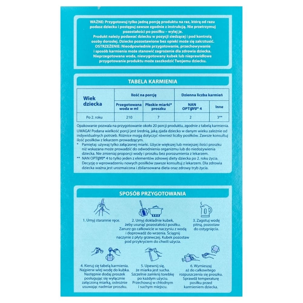 Nestle NAN OPTIpro 4 is a milk-based product intended for young children over 2 years of age. Enriched with vitamins and minerals. It is not a substitute for breast milk, but a product designed to facilitate the proper composition of a child's diet.