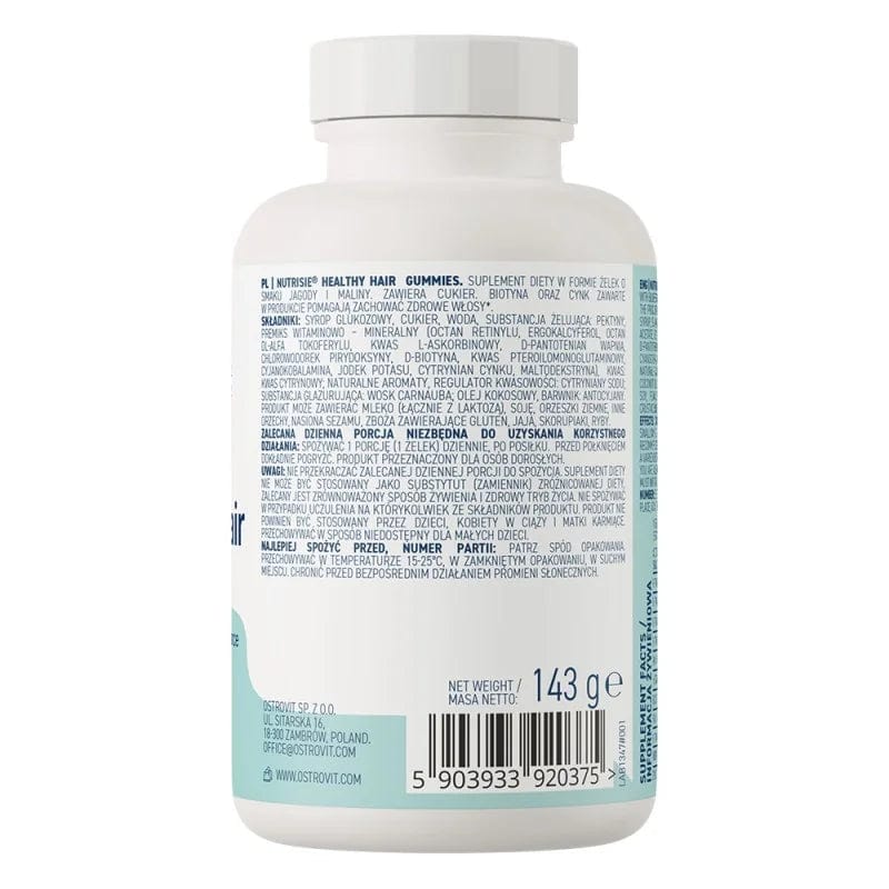 Ostrovit NUTRISIE ® Healthy Hair Gummies ir visaptverošs uztura bagātinātājs, kas nodrošina organismu ar 11 vērtīgām sastāvdaļām, tostarp D vitamīnu, folijskābi un cinku. Tas ir pieejams želejas veidā ar gardu ogu un aveņu garšu. Tas ir produkts, kas radīts cilvēkiem, kuri rūpējas par veselīgu un skaistu izskatu.