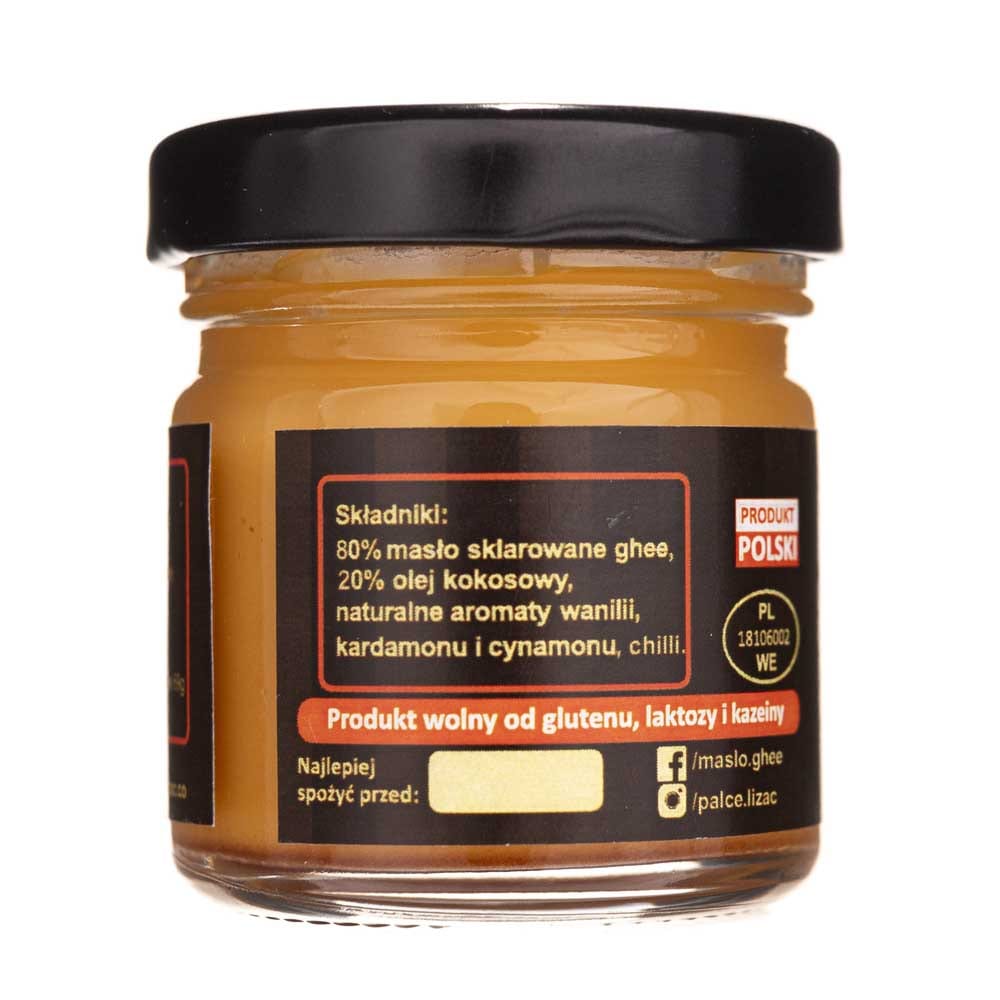 80% dzidrinats ghi sviests,20% kokosriekstu ella, dabiskas vanilas, kardamona un kanela, čilli garšas.