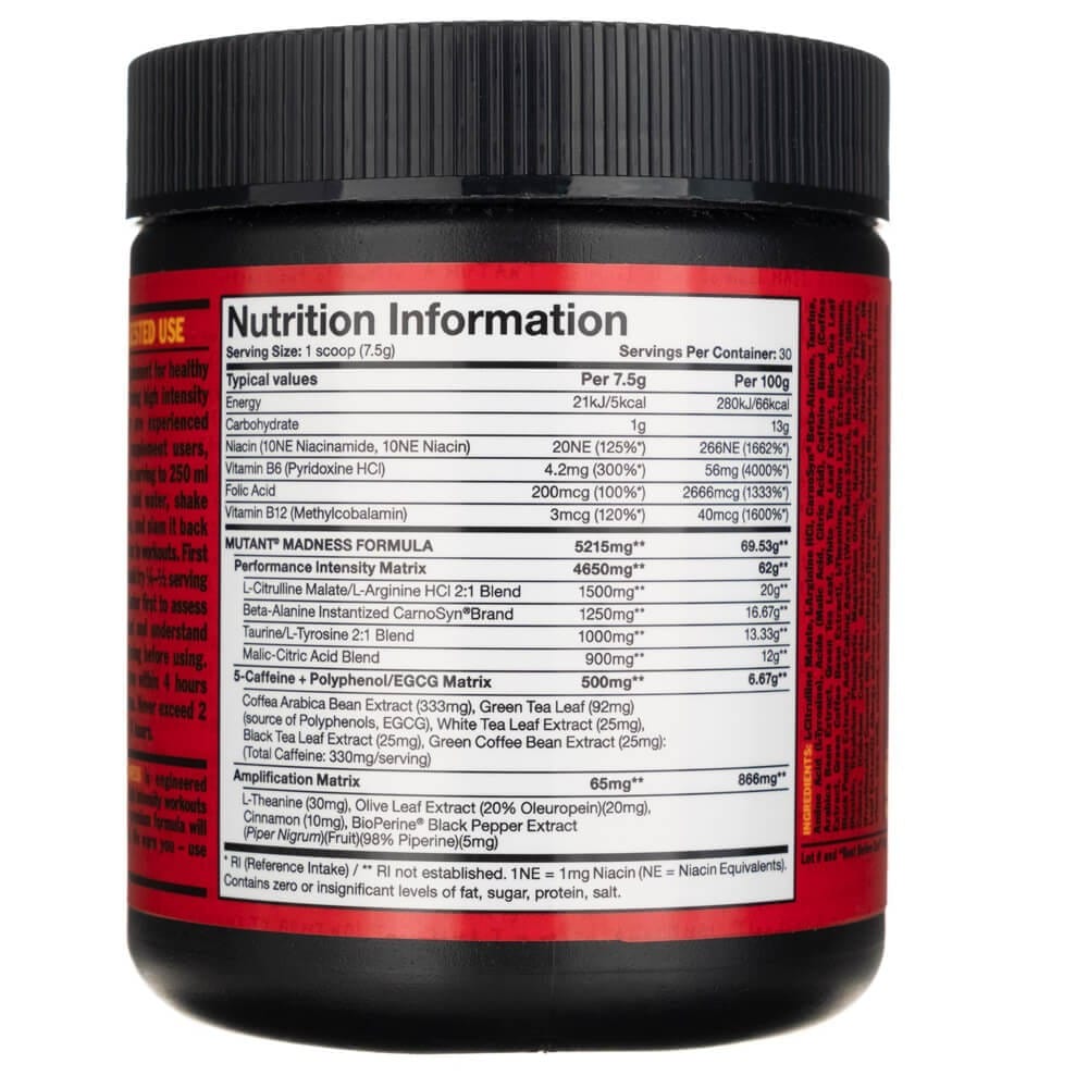 PVL Mutant Madness ir pulverveida uztura bagātinātājs, kas paredzēts visintensīvākajiem treniņiem. Mutant Madness satur arginīnu, citrulīnu, beta-alanīnu un citas augstākās kvalitātes sastāvdaļas, lai vislabāk atbalstītu katru Jūsu treniņu.
