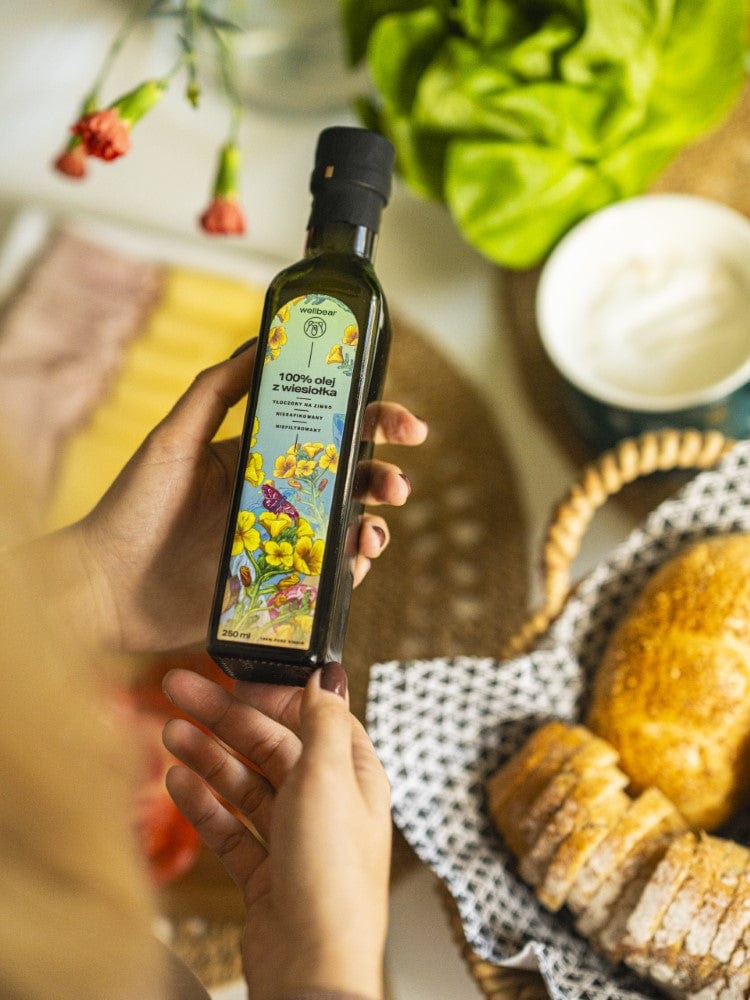 Evening primrose oil is a product obtained by cold pressing carefully selected seeds of a plant found quite commonly in fields, meadows and wasteland. Cold-pressed, unrefined oil retains all the nutritional values of evening primrose seeds, appreciated both in the prevention and treatment of many diseases, as well as in cosmetics. The product is packed with great care in special, tinted thick glass bottles, ideal for storing unrefined vegetable oils.